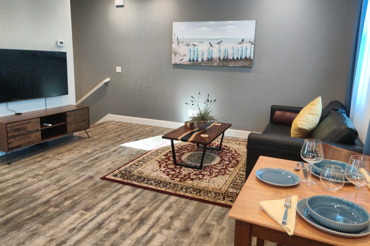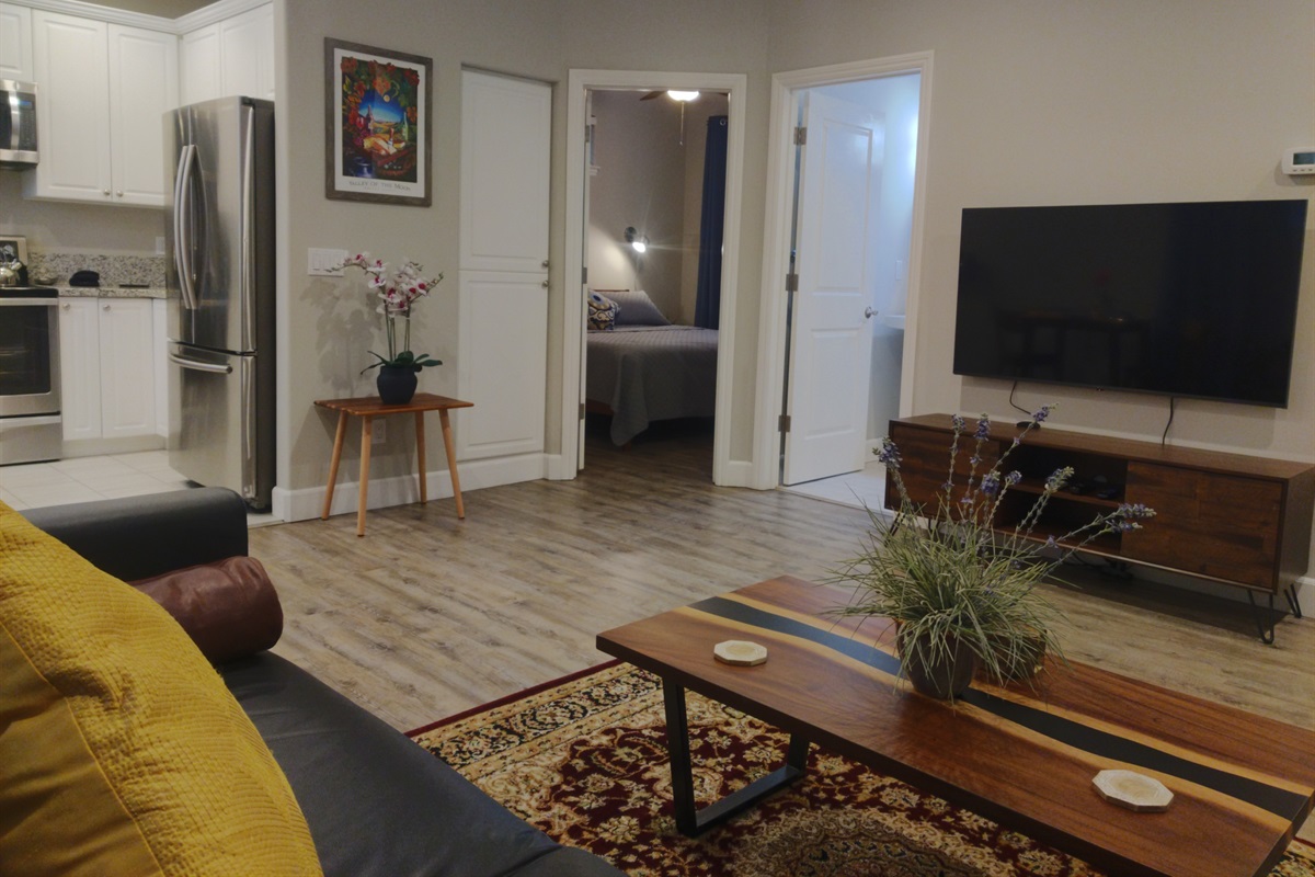 Once you are in the unit, there is an open floor plan with the living room and kitchen connected. The dining area is between the two. The living room has a leather couch with a *fold out* queen bed. This bed has wood slats for head and torso, but due to the thinner mattress common to a fold out bed, it is best for smaller persons and children. There is a 55 inch 4k flat screen TV in this room connected to a roku box. There are several free channels with films, news, family programs, etc available on the roku, or just log in with your preferred on-demand service. Internet is via wifi, which is connected to a 1 Gbs fiber-optic service from Sonic.